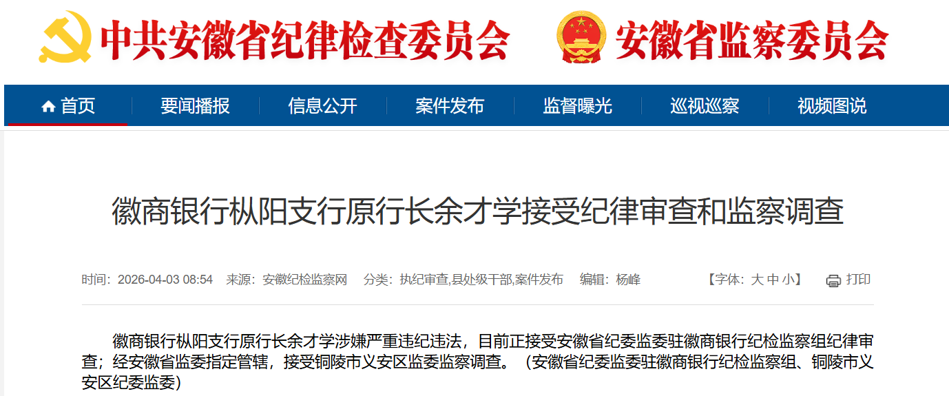 近日,安徽纪检监察网发布官方通报,徽商银行枞阳支行原行长余才学涉嫌严重违纪违法,目前正接受安徽省纪委监委驻徽商银行纪检监察组纪律审查;经安徽省监委指定管辖,铜陵市义安区监委对其实施监察调查。
