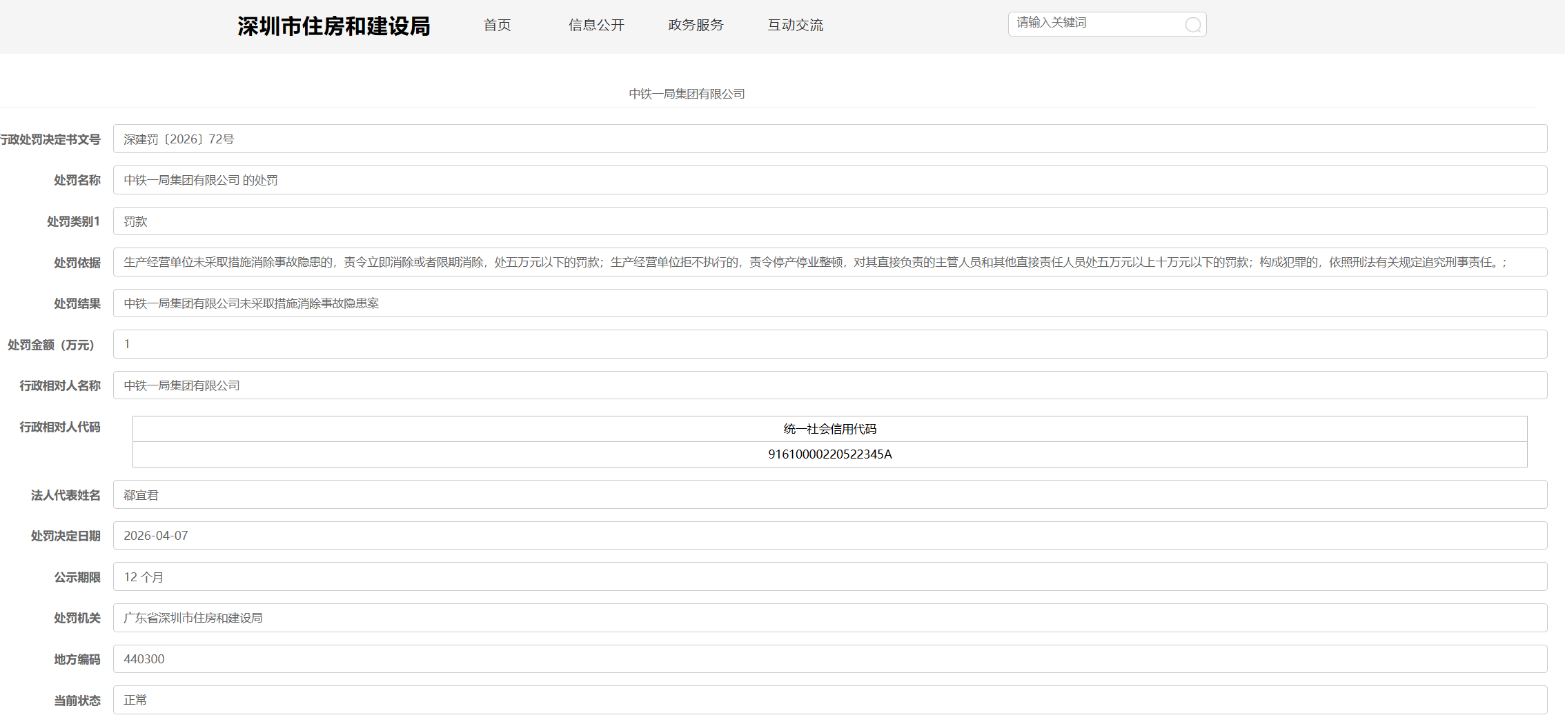 南都·湾财社记者注意到,4月7日,广东省深圳市住房和建设局对中铁一局集团有限公司作出行政处罚,因该公司存在未采取措施消除事故隐患的违法行为,被处以1万元罚款,处罚公示期为12个月。