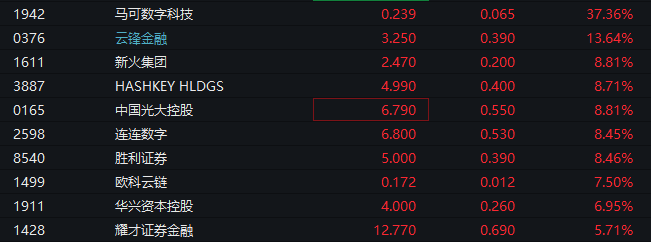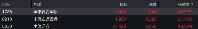 港股方面,国泰君安国际涨超40%,马可数字科技涨超30%,申万宏源香港涨超20%,云峰金融涨超10%。