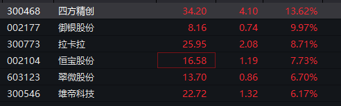 截至发稿,四方精创涨超13%,御银股份涨停,拉卡拉涨超8%。