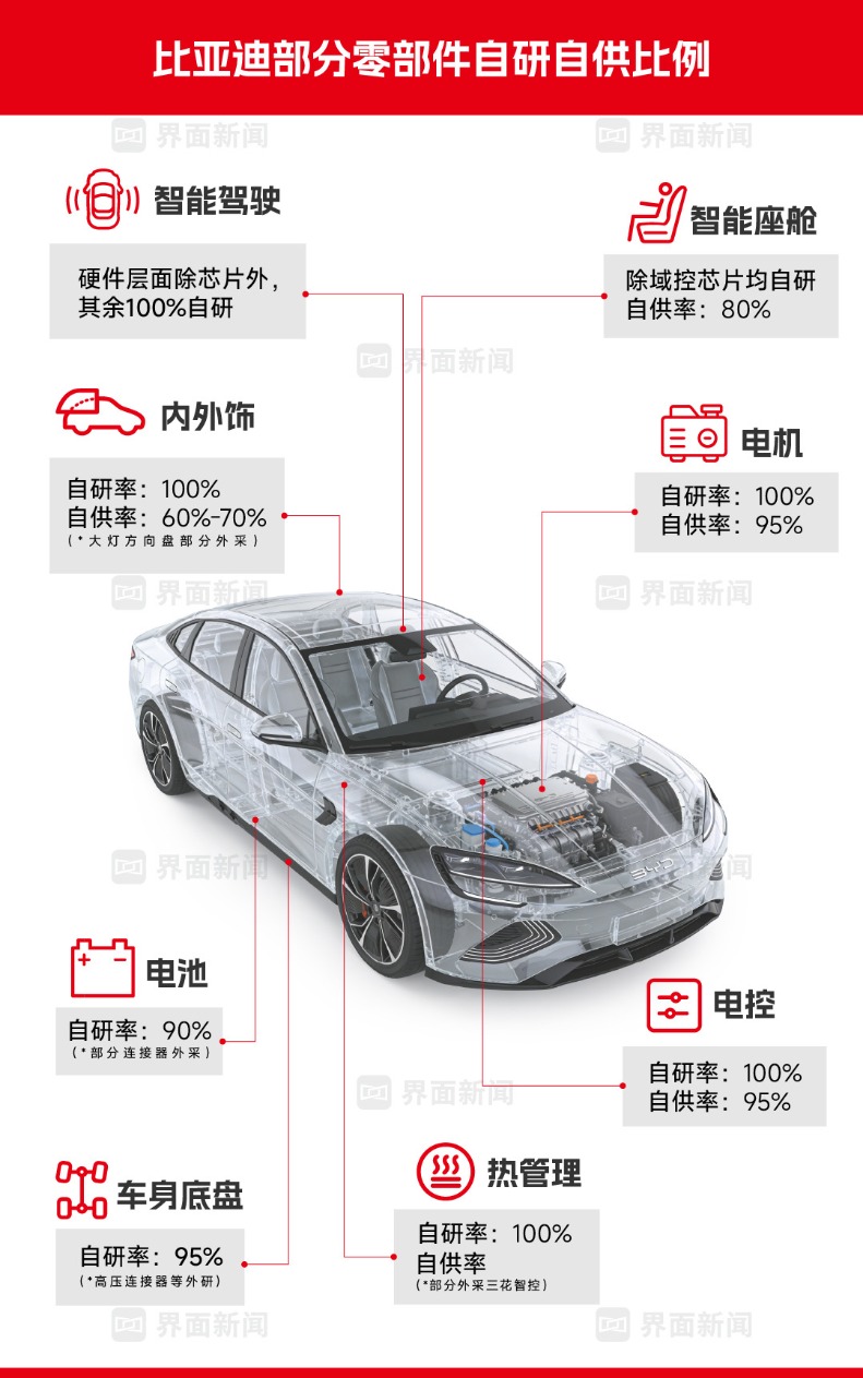 零跑创始人朱江明曾向界面新闻举例,自研自制车灯,可以让一辆物料成本10万元的电动车,节省3000元。上述三电研发人员透露,比亚迪第四代DM混动技术的成本,较其他品牌低近5000元。瑞银曾在2003年拆解比亚迪海豹,发现其成本较国产特斯拉Model 3还要低15%。