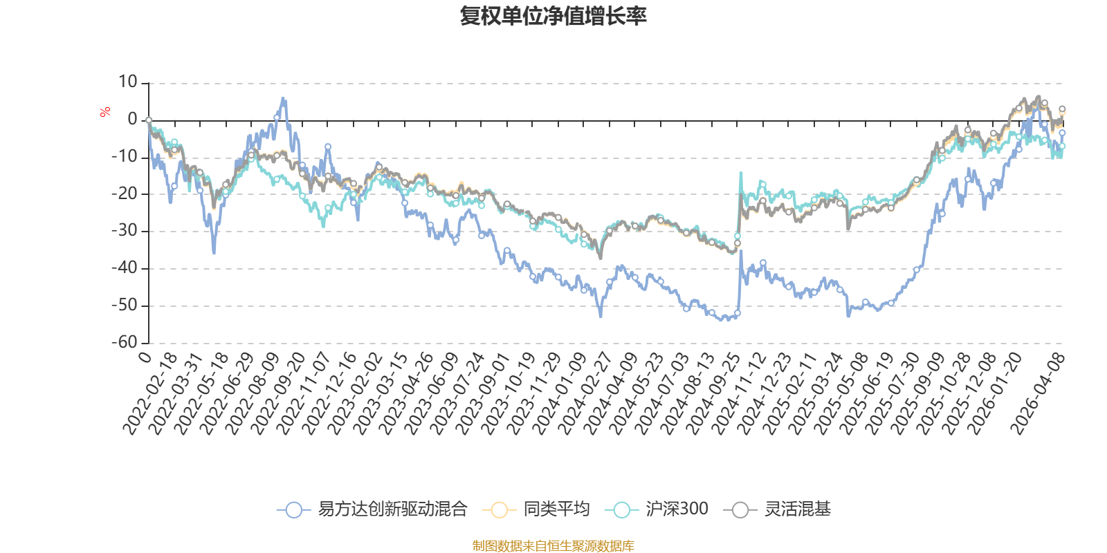 截至4月8日,易方达创新驱动混合近三个月复权单位净值增长率为7.67%,位于同类可比基金137/1287;近半年复权单位净值增长率为15.89%,位于同类可比基金123/1286;近一年复权单位净值增长率为105.49%,位于同类可比基金68/1286;近三年复权单位净值增长率为29.42%,位于同类可比基金355/1286。
