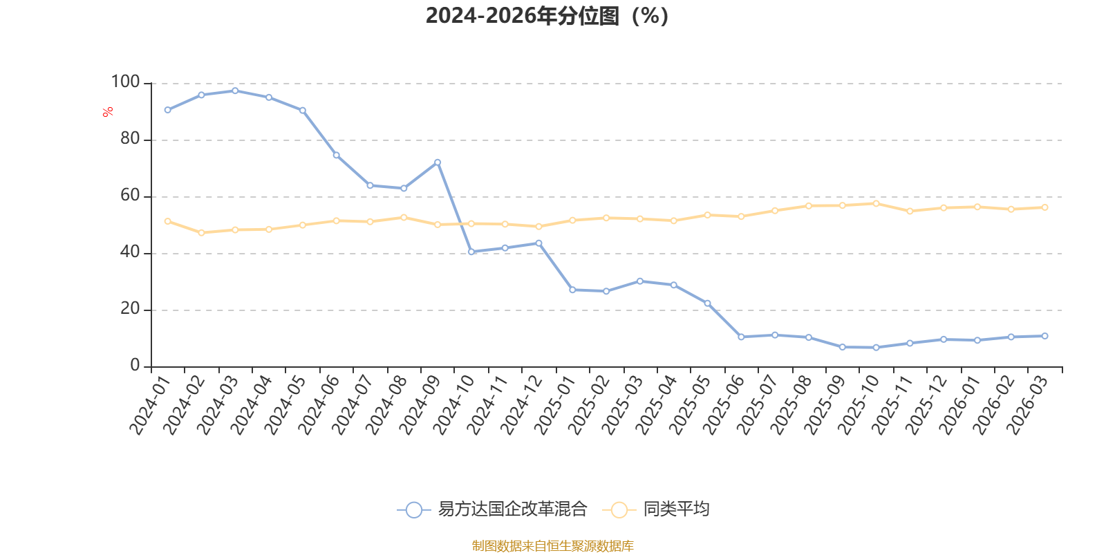 通过所选区间该基金净值增长率分位图,可以观察该基金与同类基金业绩比较情况。图为坐标原点到区间内某时点的净值增长率在同类基金中的分位数。