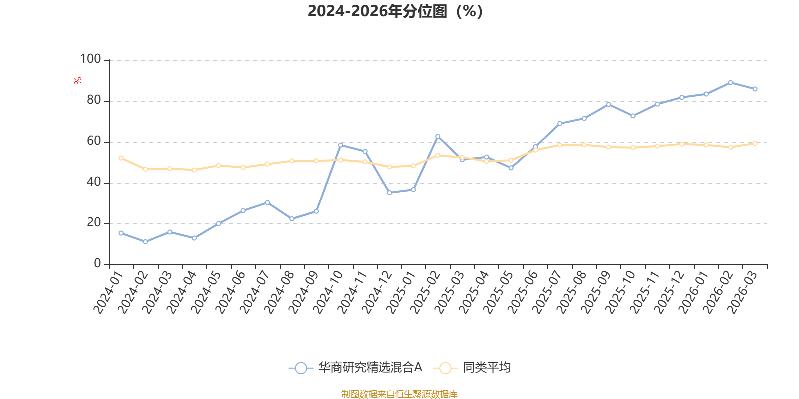 通过所选区间该基金净值增长率分位图,可以观察该基金与同类基金业绩比较情况。图为坐标原点到区间内某时点的净值增长率在同类基金中的分位数。
