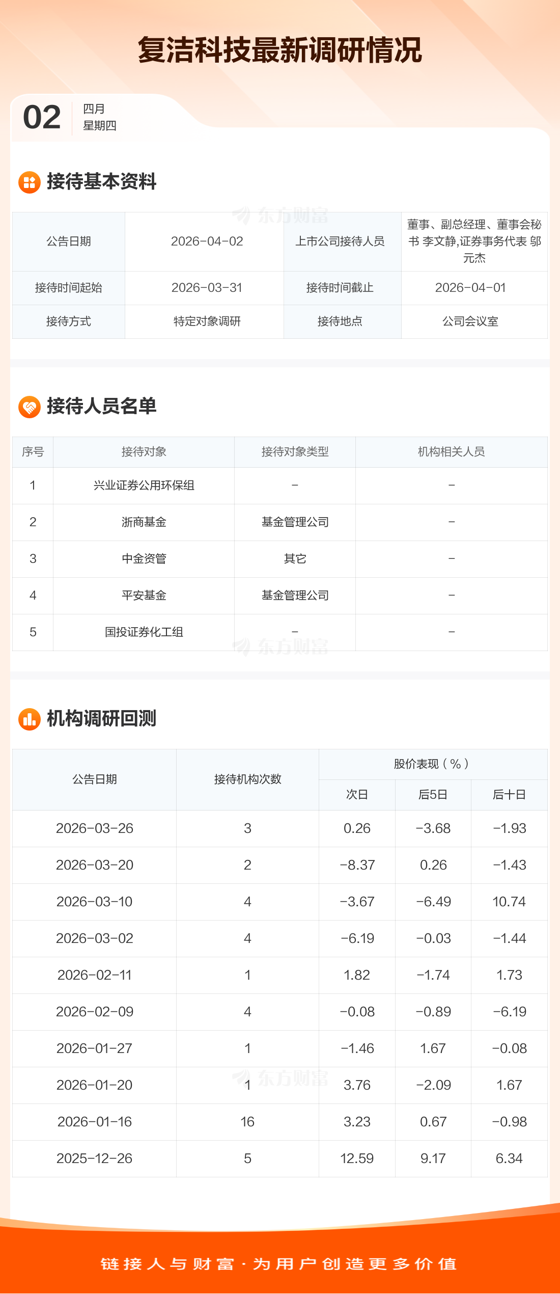 复洁科技4月2日公告称,3月31日至4月1日接待兴业证券公用环保组等5家机构调研。接待人员包括董事、副总经理、董事会秘书 李文静,证券事务代表 邬元杰。
