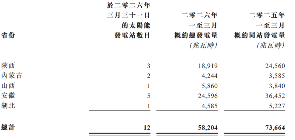 4月10日,江山控股(00295)发布公告,2026年第一季度,公司拥有的太阳能发电站总发电量约为5.82万兆瓦时,2025年同期则约为7.37万兆瓦时。截至2026年3月31日,公司总装机量为300兆瓦。具体数据如下: