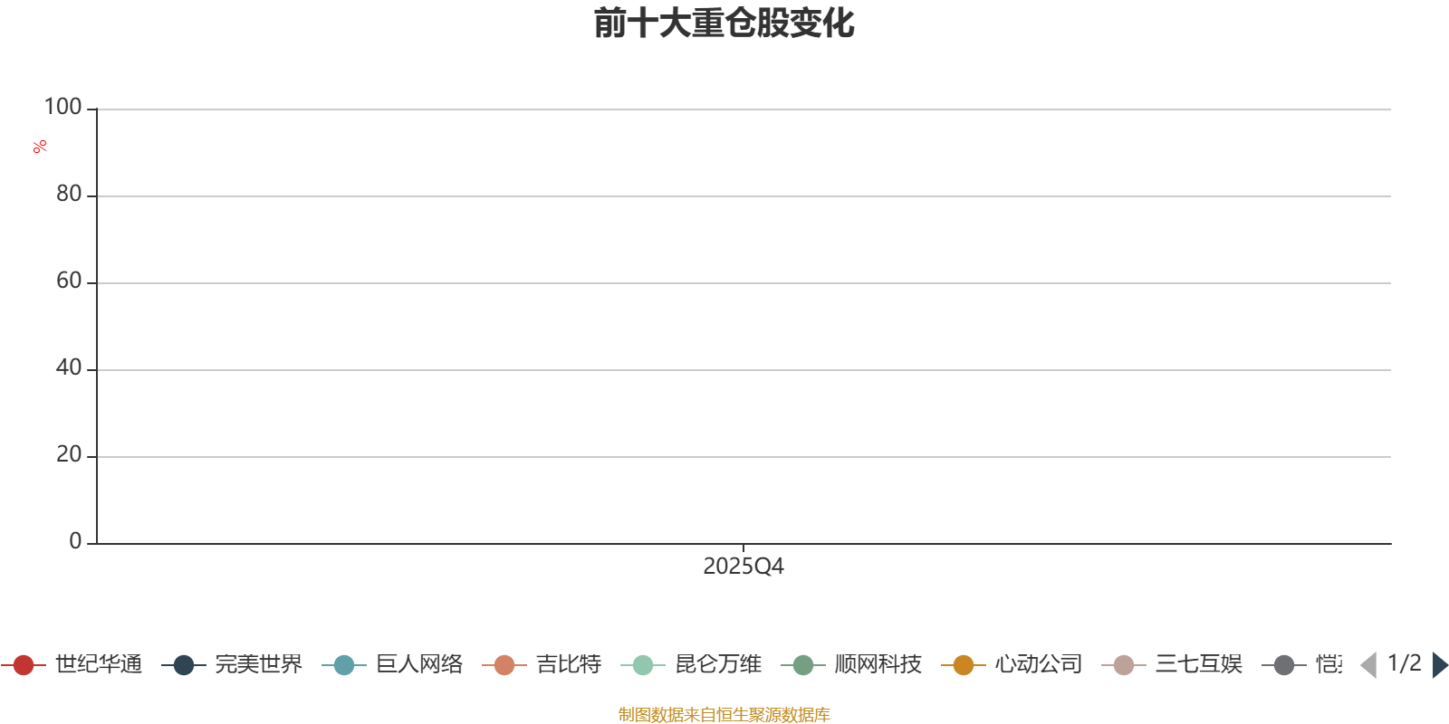 该基金持股集中度较高。截至2025年末,基金十大重仓股分别是巨人网络、神州泰岳、完美世界、世纪华通、三七互娱、吉比特、恺英网络、昆仑万维、顺网科技、心动公司。