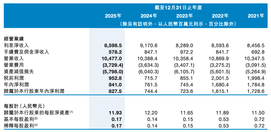 利息净收入作为银行传统存贷业务的核心指标,在2025年同比下降6.24%至85.99亿元,净息差由2024年的1.92%降至1.75%。该行在财报中解释称,随着利率市场化推进,宏观市场利率水平下行,客户贷款及垫款和金融投资业务收益率下降,同时积极落实国家减费让利政策,共同拉低了生息资产平均收益率。