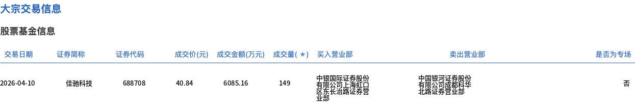 原标题:佳驰科技今日大宗交易折价成交149万股,成交额6085.16万元