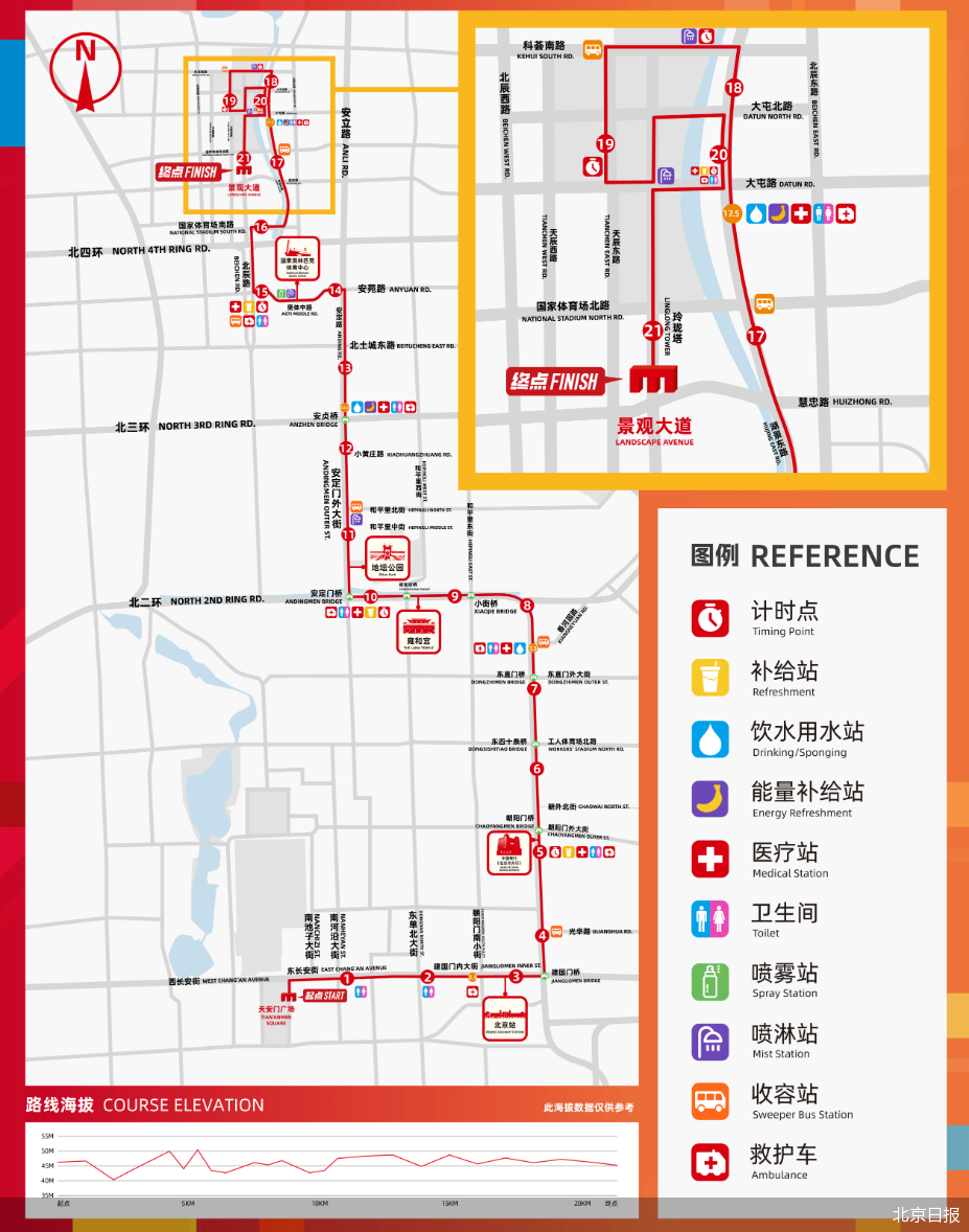 2026北京国际长跑节—北京半程马拉松比赛定于4月12日(星期日)7时在京举行。比赛起点设在天安门广场东侧路,终点设在奥林匹克公园中心区北中轴景观大道。具体比赛路线是:由天安门广场东侧路起点出发,经东长安街,东、北二环辅路(建国门桥至安定门桥外环方向),安外大街,安定路,奥体中路,北辰路(南向北),国家体育场南路(西向东),湖景东路(南向北),科荟南路(东向西),天辰东路(北向南),大屯路(西向东),北中轴景观大道(南向北),大屯北路(西向东),湖景东路(北向南),大屯路(东向西),北中轴景观大道(北向南)至奥林匹克公园中心区比赛终点。