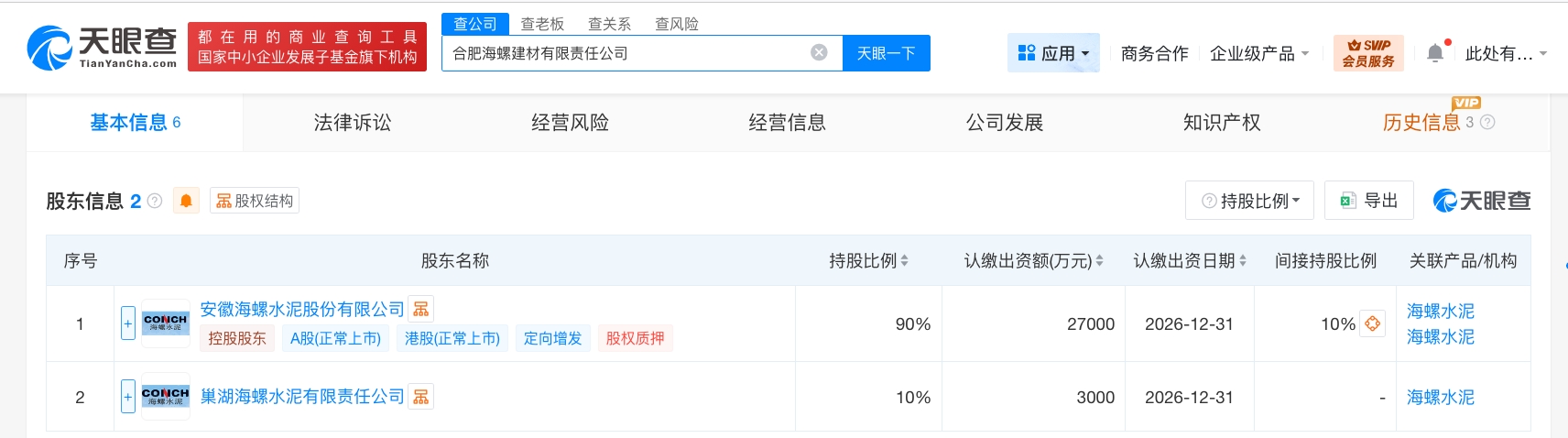 南方财经4月10日电,天眼查App显示,近日,合肥海螺建材有限责任公司成立,法定代表人为程小兵,注册资本3亿人民币,经营范围包括水泥生产、水泥制品制造、新型建筑材料制造、轻质建筑材料制造、水泥制品销售、建筑材料销售、集中式快速充电站等。股东信息显示,该公司由海螺水泥(600585)及旗下巢湖海螺水泥有限责任公司共同持股。