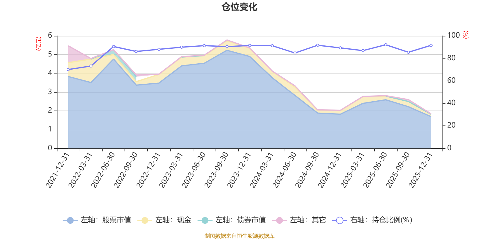 据定期报告数据统计,近三年平均股票仓位为89.67%,同类平均为85.83%。2025年上半年末基金达到92.1%的最高仓位,2021年末最低,为70.05%。