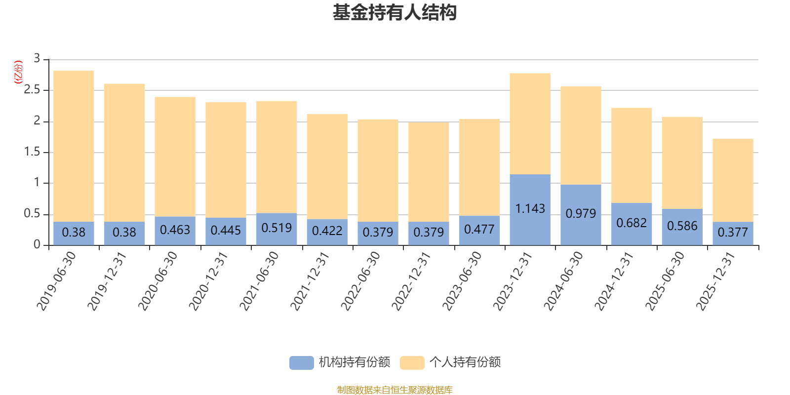 截至2025年12月31日,基金持有人共计1.93万户,合计持有1.72亿份。其中管理人员工持有12.26万份,占比0.07%,机构持有份额占比21.95%,个人投资者占比78.05%。