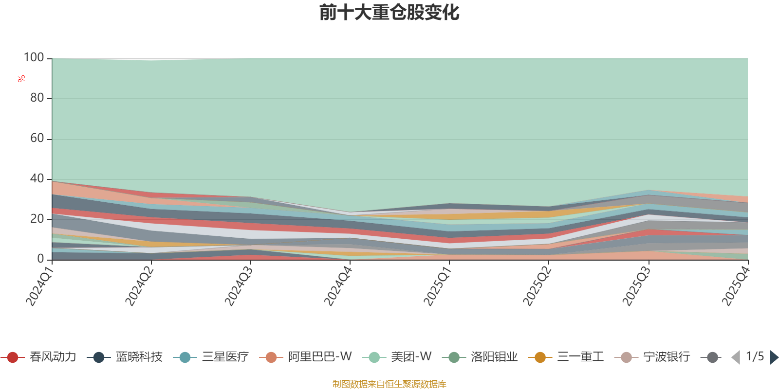 截至2025年末,基金十大重仓股分别是中际旭创、宁德时代、新易盛、紫金矿业、洛阳钼业、寒武纪、中国平安、宁波银行、比亚迪、贵州茅台。
