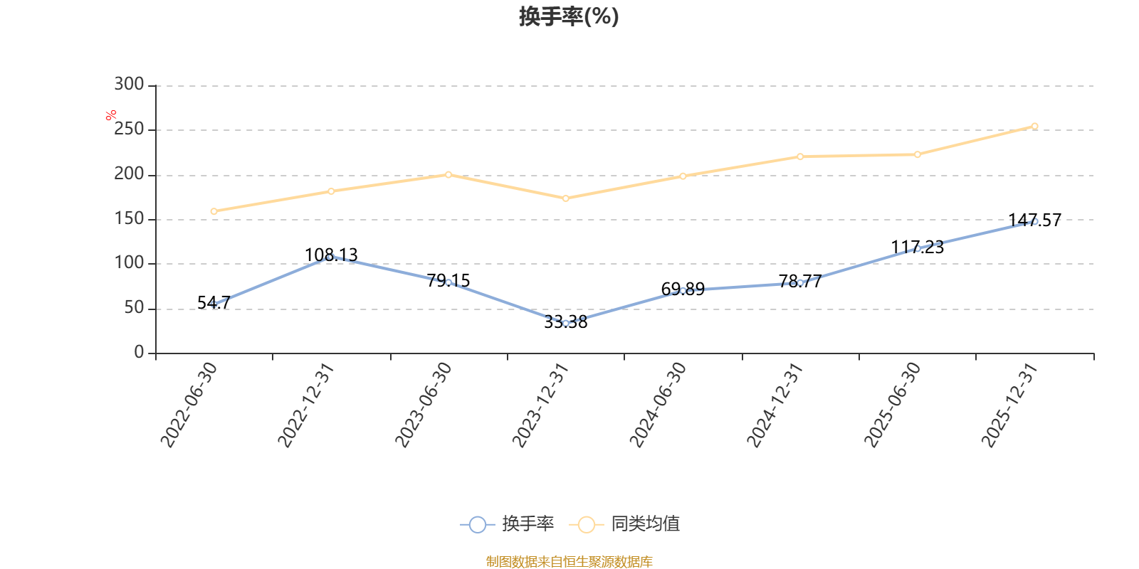 截至2025年12月31日,基金最近一年换手率约266.69%,持续低于同类均值。