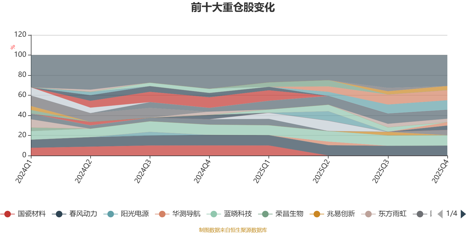 该基金持股集中度较高,近2年前十大重仓股集中度长期超过60%。截至2025年末,基金十大重仓股分别是蓝晓科技、热景生物、春风动力、悦康药业、腾讯控股、阿里巴巴-W、宁德时代、中际旭创、新易盛、东山精密。