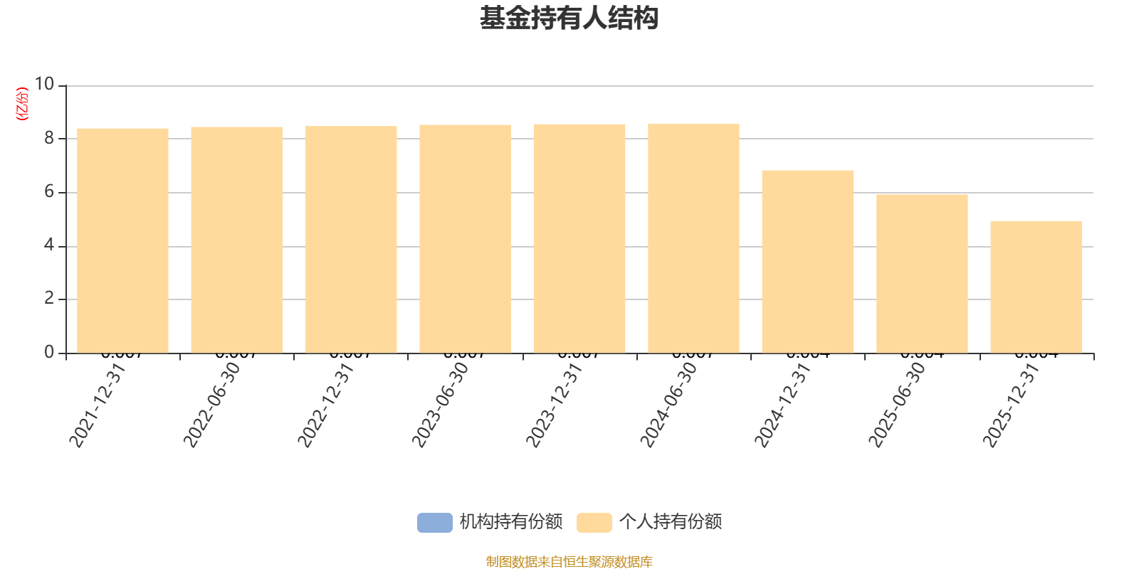 截至2025年12月31日,基金持有人共计5869户,合计持有4.93亿份。其中管理人员工持有863.95万份,占比1.75%,机构持有份额占比0.08%,个人投资者占比99.92%。