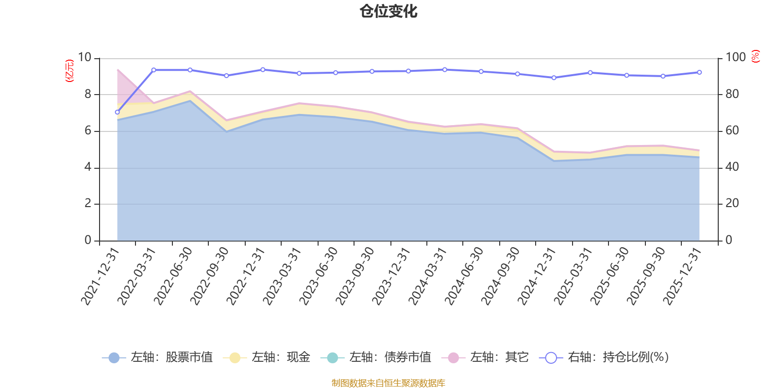 据定期报告数据统计,近三年平均股票仓位为91.83%,同类平均为85.83%。2022年末基金达到93.73%的最高仓位,2021年末最低,为70.46%。