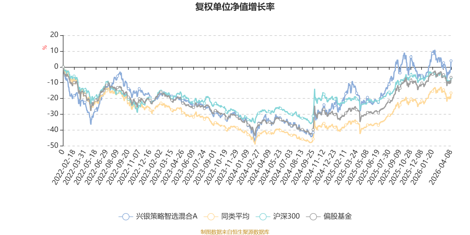 截至4月8日,兴银策略智选混合A近三个月复权单位净值增长率为3.21%,位于同类可比基金200/689;近半年复权单位净值增长率为-2.95%,位于同类可比基金510/689;近一年复权单位净值增长率为43.95%,位于同类可比基金304/685;近三年复权单位净值增长率为27.72%,位于同类可比基金118/417。