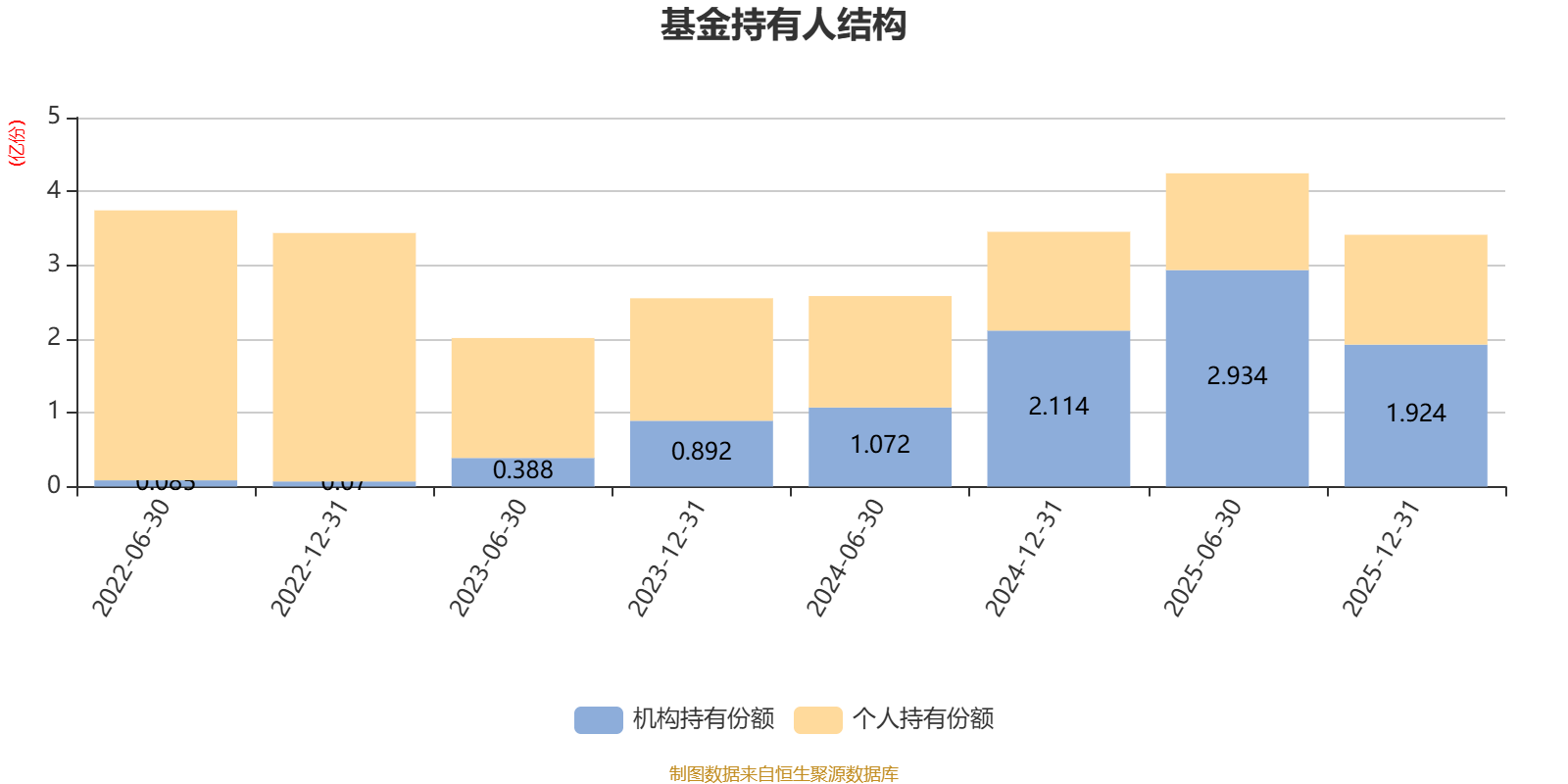 截至2025年12月31日,基金持有人共计6355户,合计持有3.41亿份。其中管理人员工持有598.37万份,占比1.75%,机构持有份额占比56.40%,个人投资者占比43.60%。