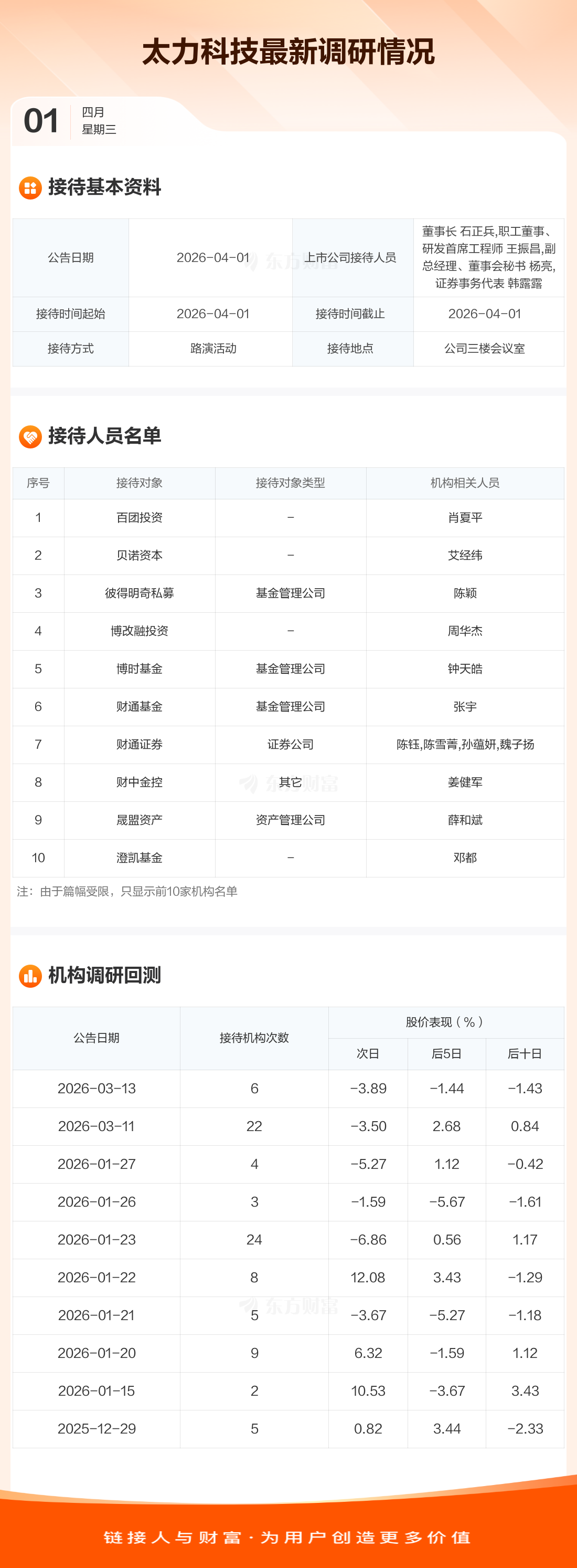 太力科技4月1日公告称,4月1日接待百团投资等183家机构调研。接待人员包括董事长 石正兵,职工董事、研发首席工程师 王振昌,副总经理、董事会秘书 杨亮,证券事务代表 韩露露。