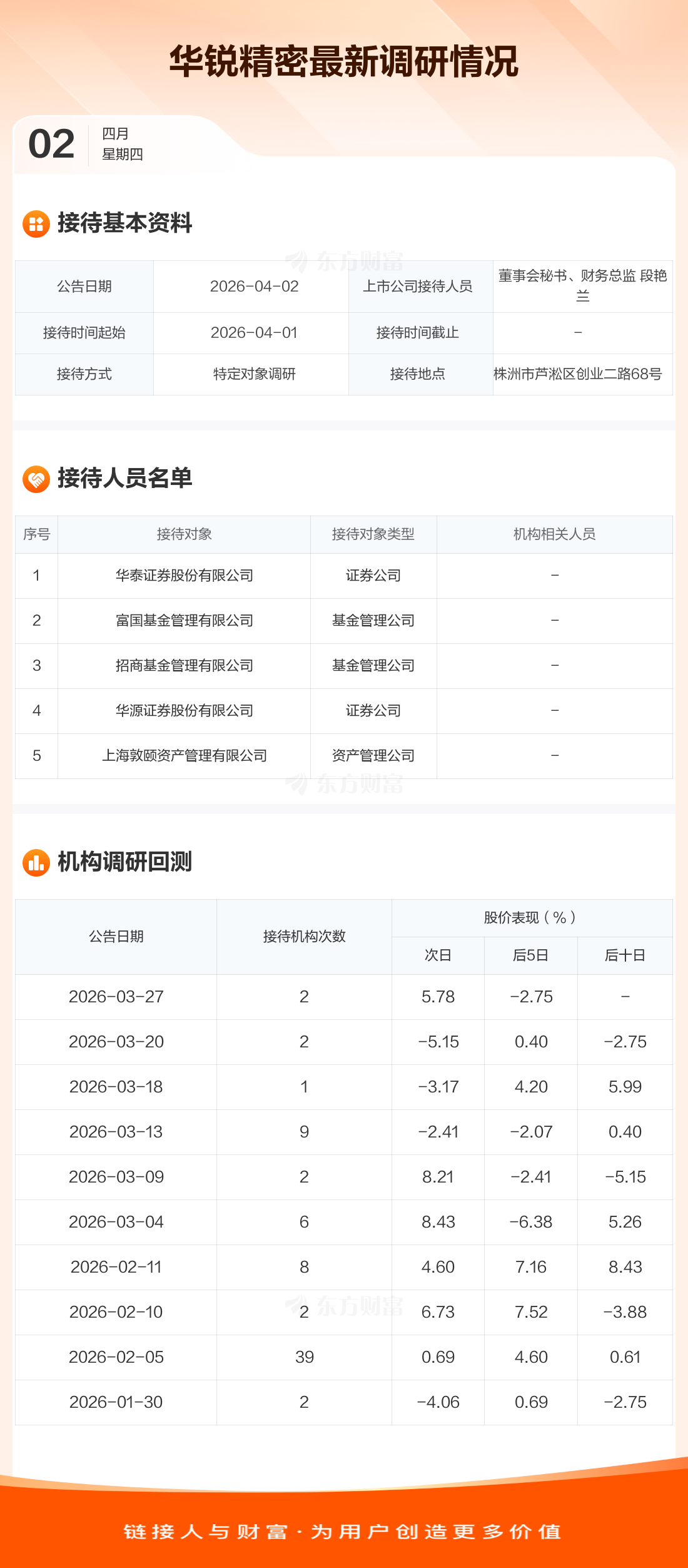 华锐精密4月2日公告称,4月1日接待华泰证券股份有限公司等5家机构调研。接待人员包括董事会秘书、财务总监 段艳兰。