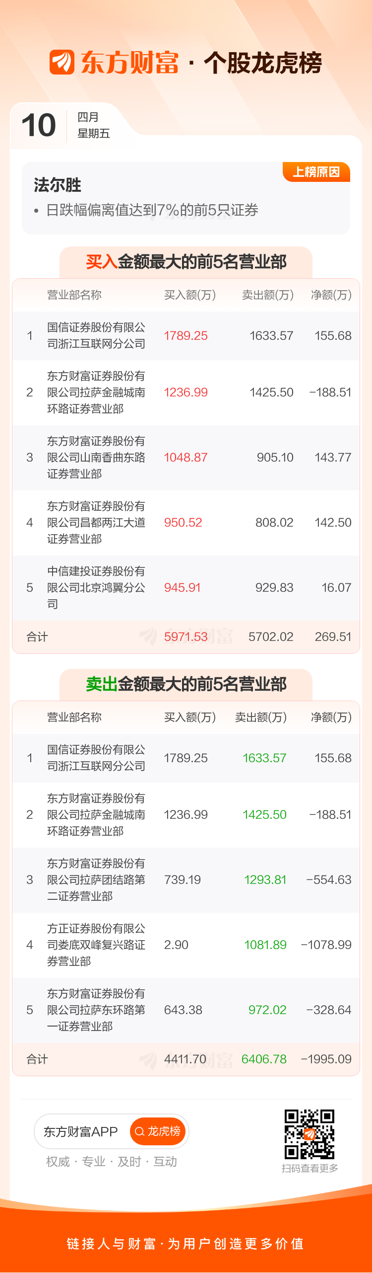 交易所2026年4月10日公布的交易公开信息显示,法尔胜因成为日跌幅偏离值达到7%的前5只证券、连续三个交易日内,跌幅偏离值累计达到20%的证券上榜。法尔胜当日收报14.21元,涨跌幅-10.01%,偏离值-11.54%,换手率18.70%,成交额11.37亿。异常期间4月8日至4月10日,期间涨幅-19.31%,累计偏离值-24.63%,区间成交额48.31亿。