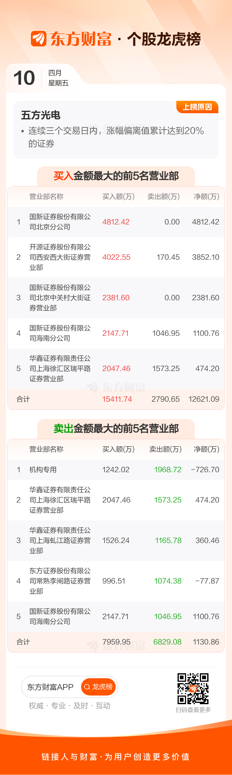 交易所2026年4月10日公布的交易公开信息显示,五方光电因成为连续三个交易日内,涨幅偏离值累计达到20%的证券上榜。五方光电当日收报16.91元,涨跌幅10.02%,换手率17.13%,成交额5.92亿。异常期间4月9日至4月10日,期间涨幅21.05%,累计偏离值20.12%,区间成交额8.37亿。
