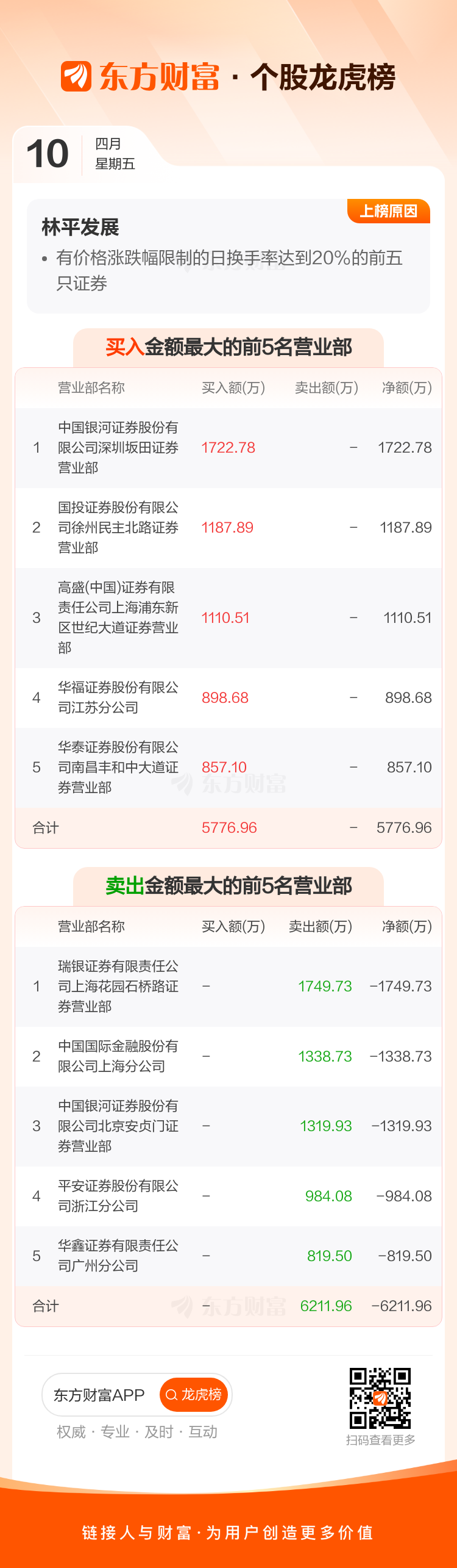 交易所2026年4月10日公布的交易公开信息显示,林平发展因成为有价格涨跌幅限制的日换手率达到20%的前五只证券上榜。林平发展当日收报56.24元,涨跌幅2.89%,偏离值36.26%,换手率36.26%,成交额3.70亿。