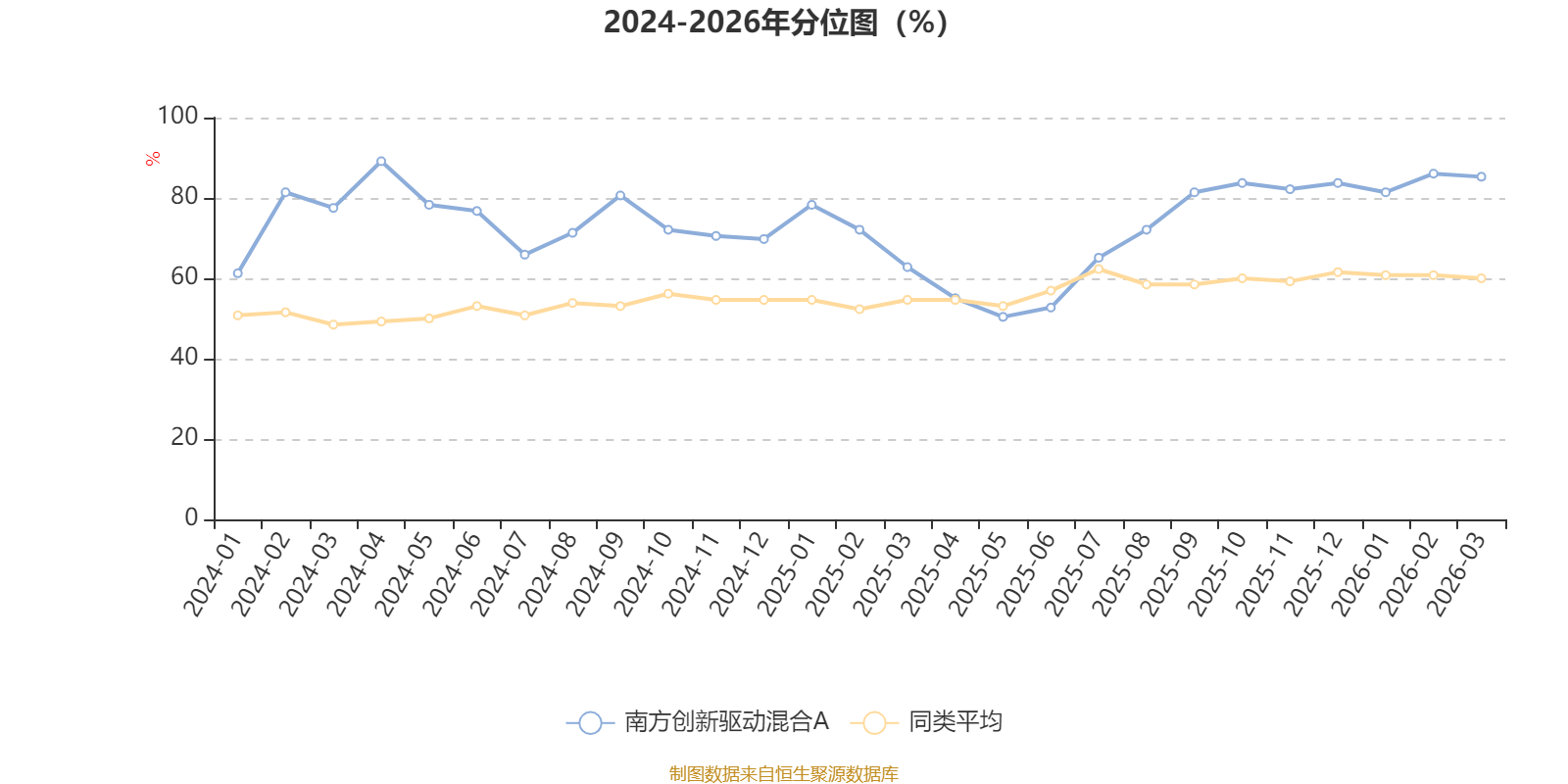 通过所选区间该基金净值增长率分位图,可以观察该基金与同类基金业绩比较情况。图为坐标原点到区间内某时点的净值增长率在同类基金中的分位数。