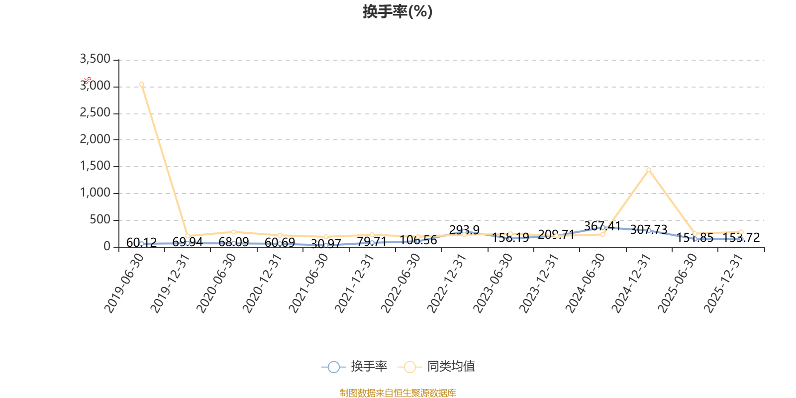 截至2025年12月31日,基金最近一年换手率约300.42%,持续1年低于同类均值。