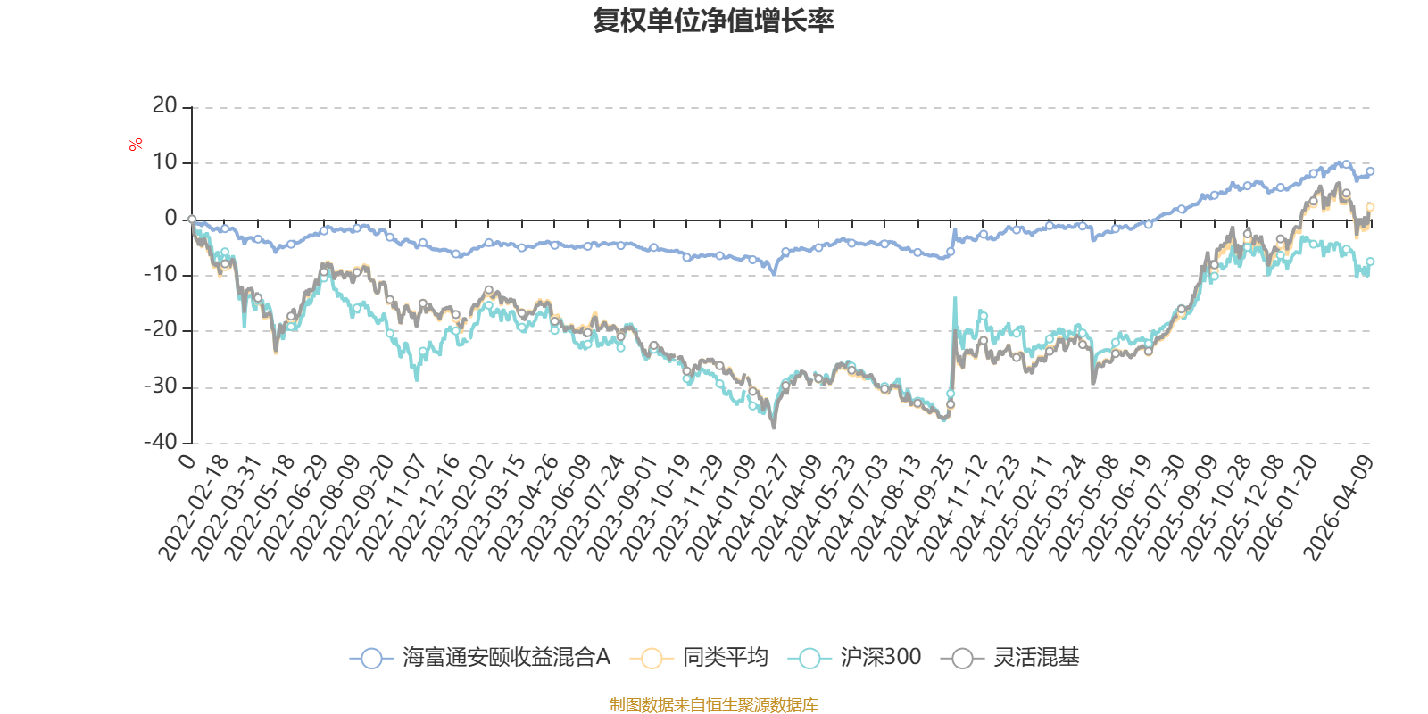 截至4月9日,海富通安颐收益混合A近三个月复权单位净值增长率为0.98%,位于同类可比基金423/1287;近半年复权单位净值增长率为1.76%,位于同类可比基金637/1286;近一年复权单位净值增长率为12.65%,位于同类可比基金998/1286;近三年复权单位净值增长率为13.23%,位于同类可比基金648/1286。