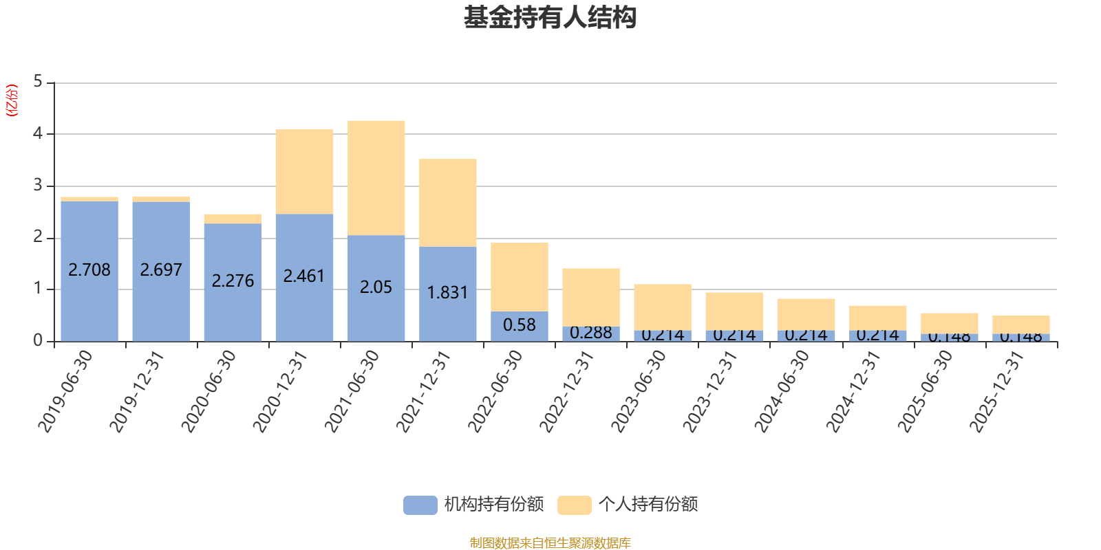 截至2025年12月31日,基金持有人共计2.71万户,合计持有4982.83万份。其中管理人员工持有55.36万份,占比1.11%,机构持有份额占比29.66%,个人投资者占比70.34%。