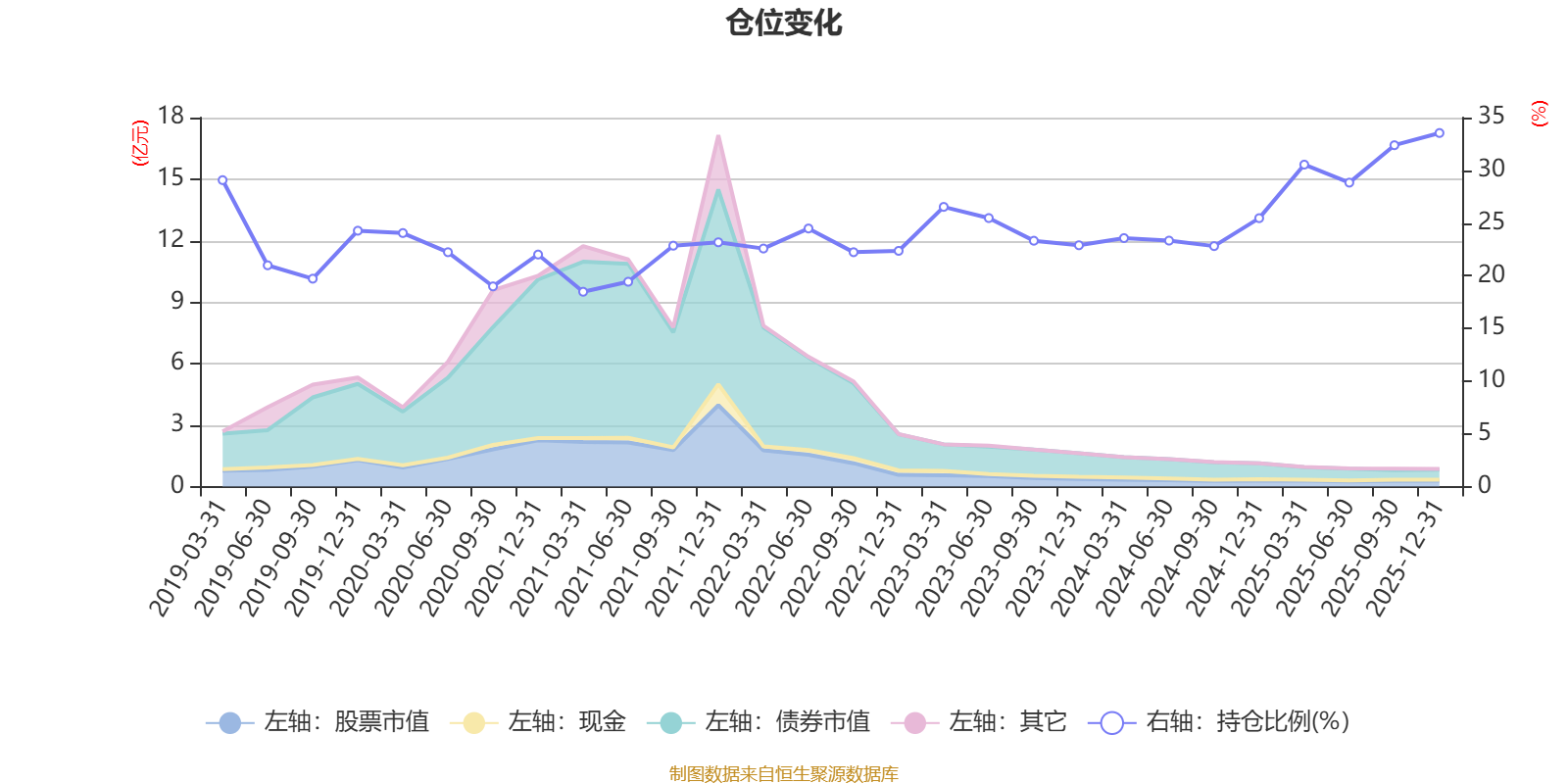 据定期报告数据统计,近三年平均股票仓位为26.56%,同类平均为72.57%。2025年末基金达到33.54%的最高仓位,2021年一季度末最低,为18.48%。