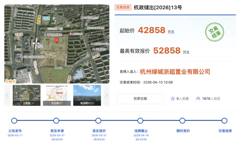 该地块经过21轮竞价后,由绿城旗下杭州绿城浙超置业有限公司以总价5.29亿元竞得,成交楼面价12950元/平方米,溢价率23.33%。