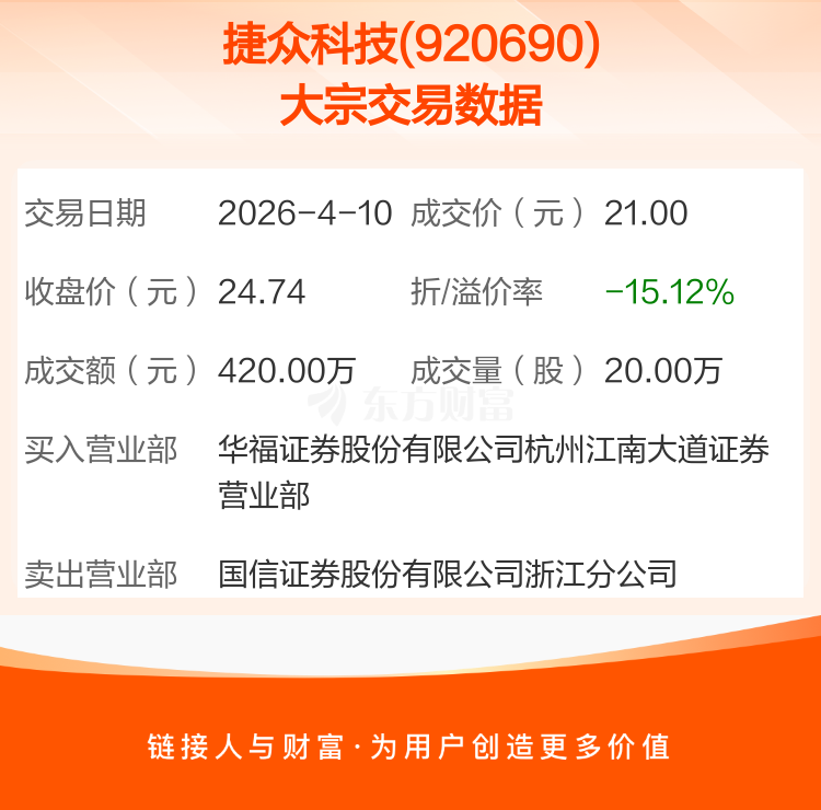 2026年4月10日,捷众科技发生1笔大宗交易,共成交20.00万股,成交金额420.00万元,占其流通市值比例为0.39%。
