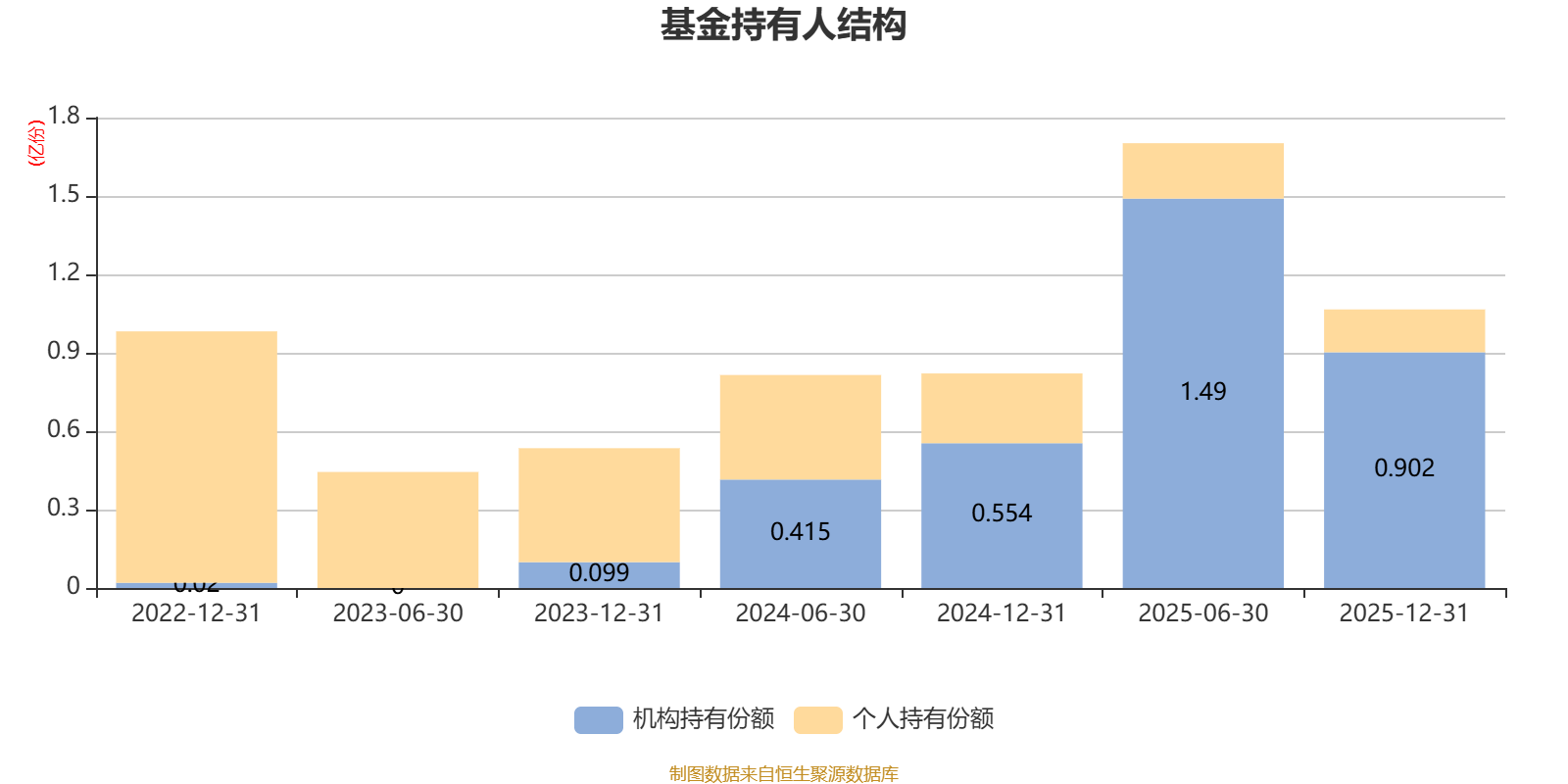 截至2025年12月31日,基金持有人共计423户,合计持有1.07亿份。其中管理人员工持有108.97万份,占比1.02%,机构持有份额占比84.62%,个人投资者占比15.38%。