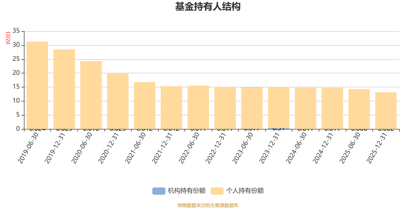 截至2025年12月31日,基金持有人共计2.96万户,合计持有13.16亿份。其中管理人员工持有12.58万份,占比0.01%,机构持有份额占比0.02%,个人投资者占比99.98%。