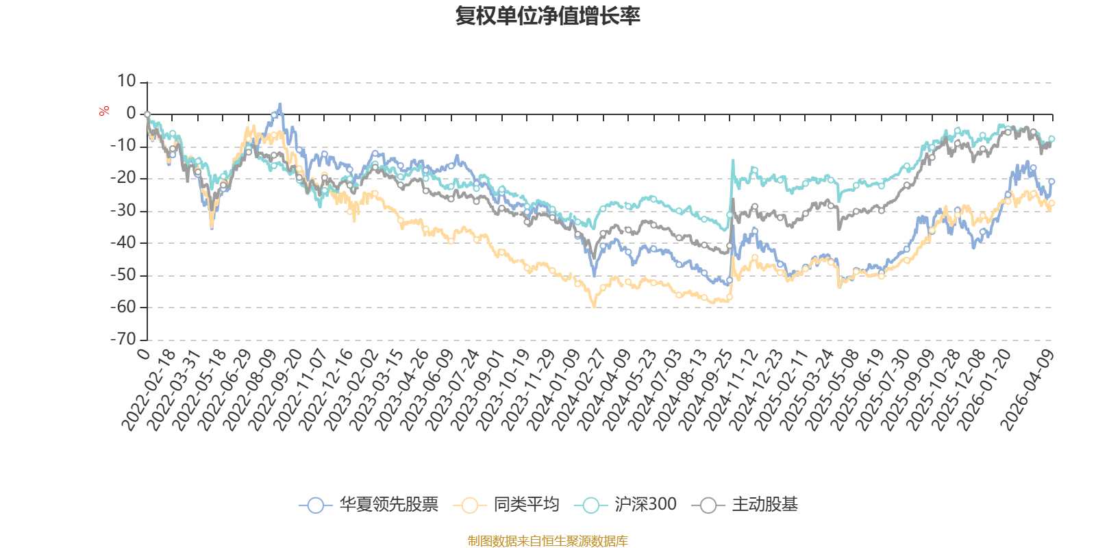 截至4月9日,华夏领先股票近三个月复权单位净值增长率为10.61%,位于同类可比基金1/39;近半年复权单位净值增长率为16.04%,位于同类可比基金3/39;近一年复权单位净值增长率为68.81%,位于同类可比基金10/39;近三年复权单位净值增长率为-8.04%,位于同类可比基金31/33。