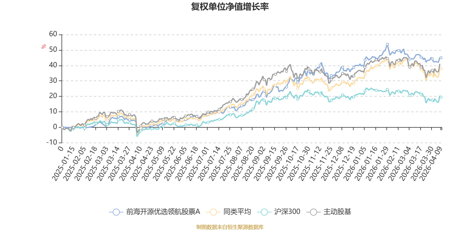 截至4月9日,前海开源优选领航股票A近三个月复权单位净值增长率为0.60%,位于同类可比基金54/121;近半年复权单位净值增长率为9.32%,位于同类可比基金26/121;近一年复权单位净值增长率为48.33%,位于同类可比基金44/120。