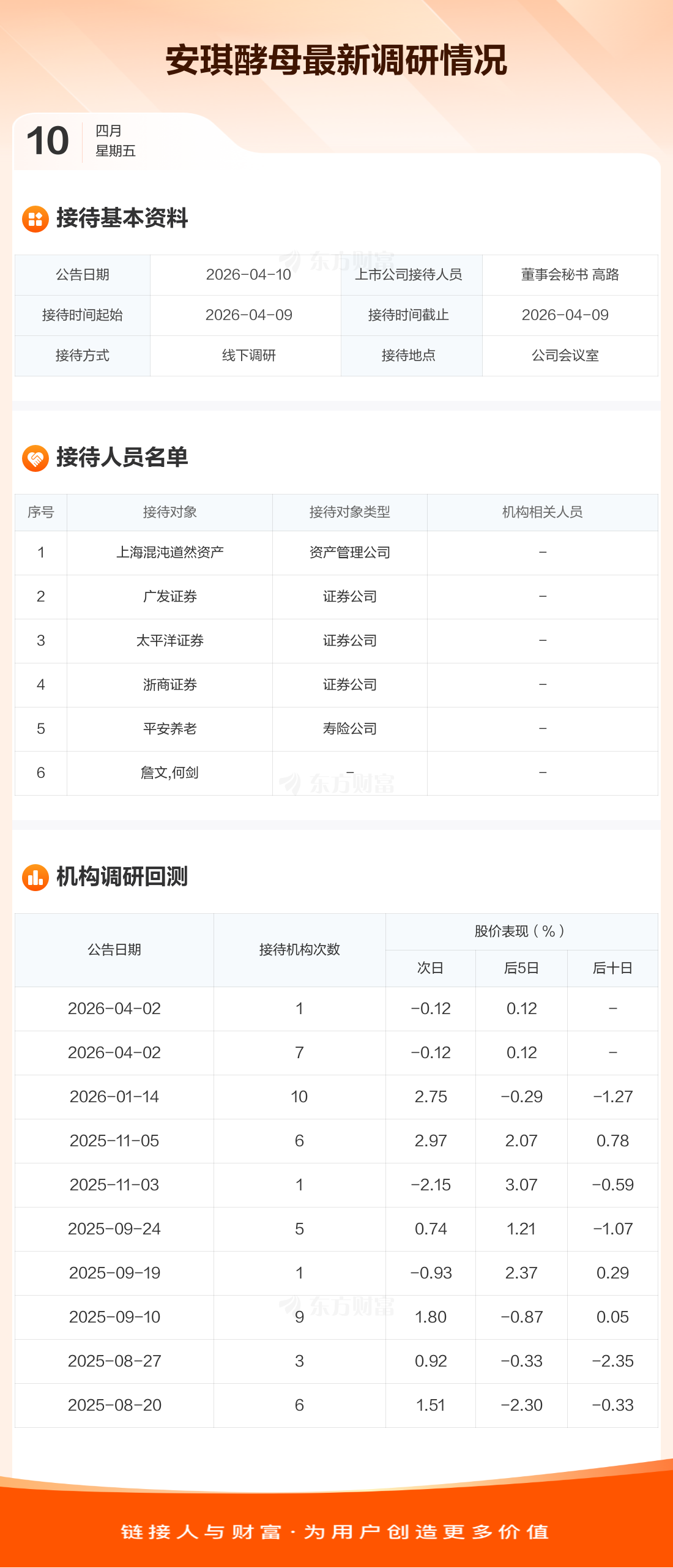 安琪酵母4月10日公告称,4月9日接待上海混沌道然资产等6家机构调研。接待人员包括董事会秘书 高路。