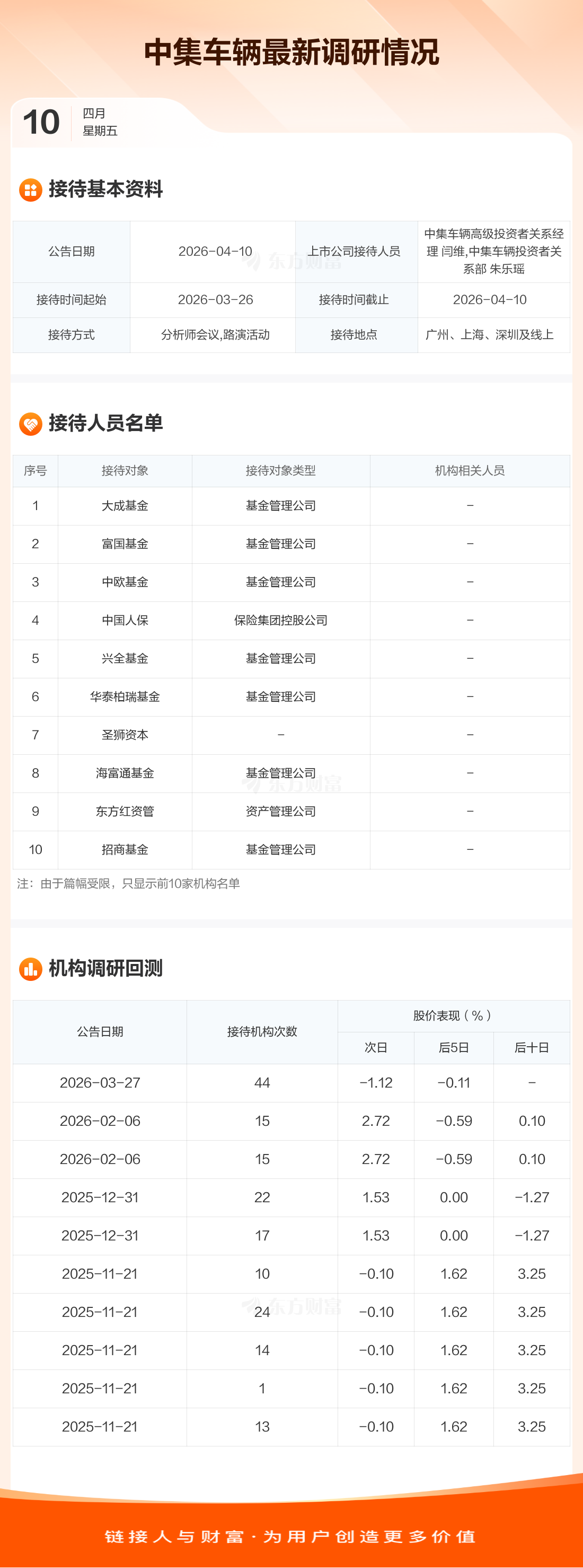 中集车辆4月10日公告称,3月26日至4月10日接待大成基金等26家机构调研。接待人员包括中集车辆高级投资者关系经理 闫维,中集车辆投资者关系部 朱乐瑶。