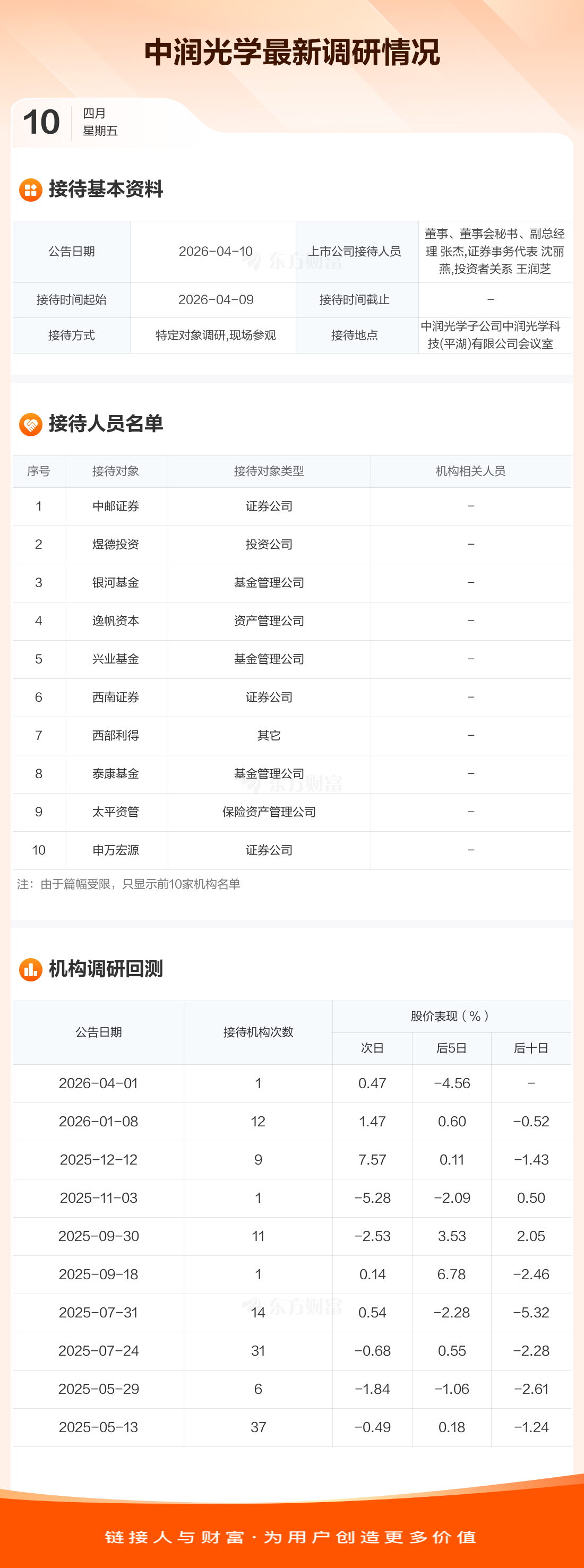 中润光学4月10日公告称,4月9日接待中邮证券等54家机构调研。接待人员包括董事、董事会秘书、副总经理 张杰,证券事务代表 沈丽燕,投资者关系 王润芝。