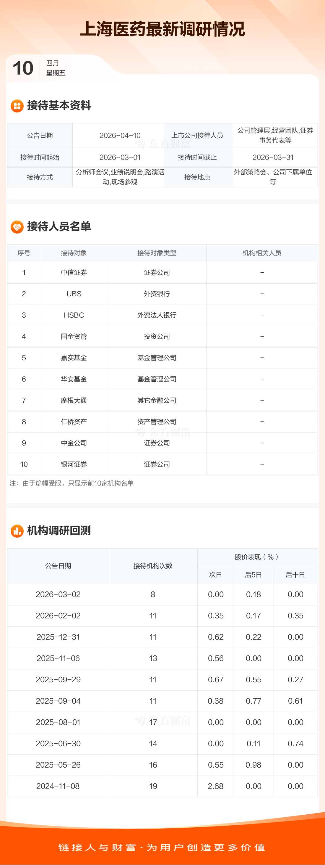 上海医药4月10日公告称,3月1日至3月31日接待中信证券等16家机构调研。接待人员包括公司管理层,经营团队,证券事务代表等。