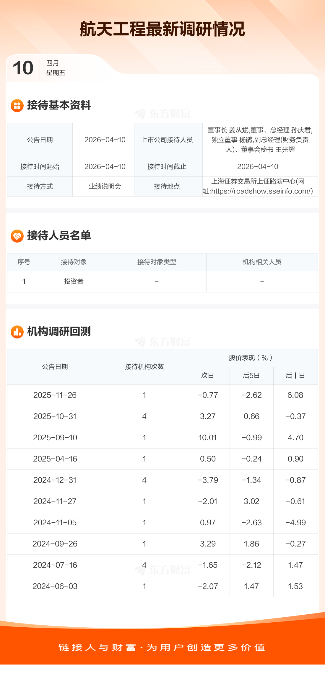 航天工程4月10日公告称,4月10日接待投资者等1家机构调研。接待人员包括董事长 姜从斌,董事、总经理 孙庆君,独立董事 杨鹃,副总经理(财务负责人)、董事会秘书 王光辉。