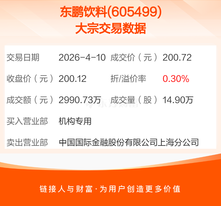 2026年4月10日,东鹏饮料发生1笔大宗交易,共成交14.90万股,成交金额2990.73万元,占其流通市值比例为0.03%。