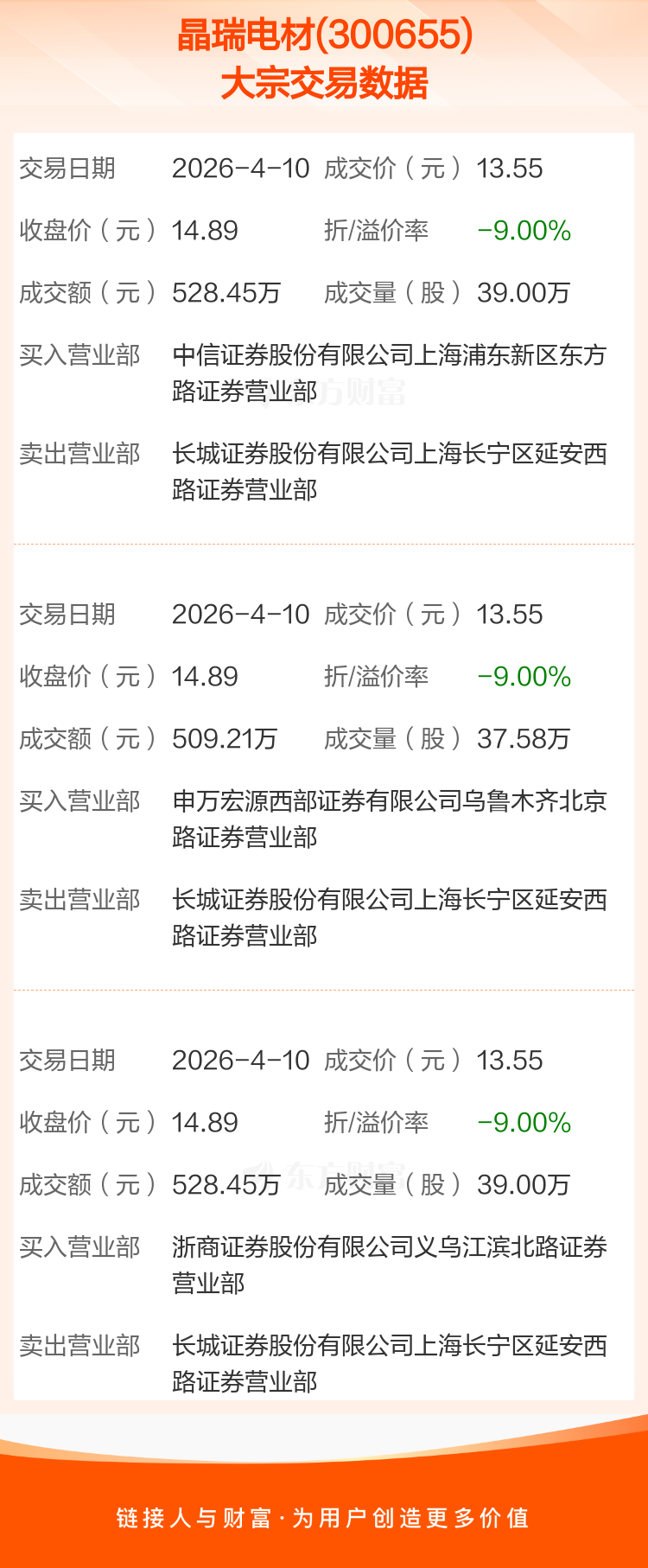 3笔大宗交易成交均价13.55元,较该股当日收盘价14.89元折价9.00%。