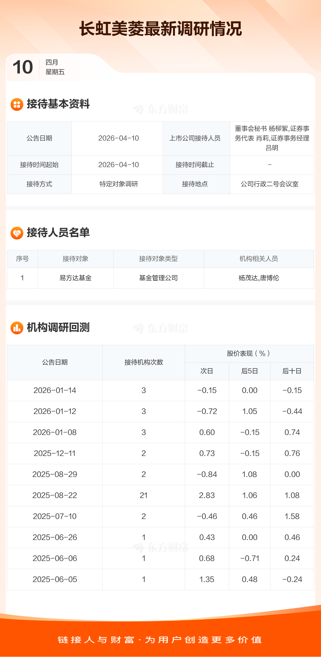 长虹美菱4月10日公告称,4月10日接待易方达基金等1家机构调研。接待人员包括董事会秘书 杨柳絮,证券事务代表 肖莉,证券事务经理 吕明。