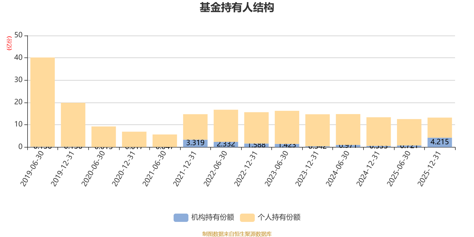 截至2025年12月31日,基金持有人共计3.85万户,合计持有13.23亿份。其中管理人员工持有321.28万份,占比0.24%,机构持有份额占比31.86%,个人投资者占比68.14%。