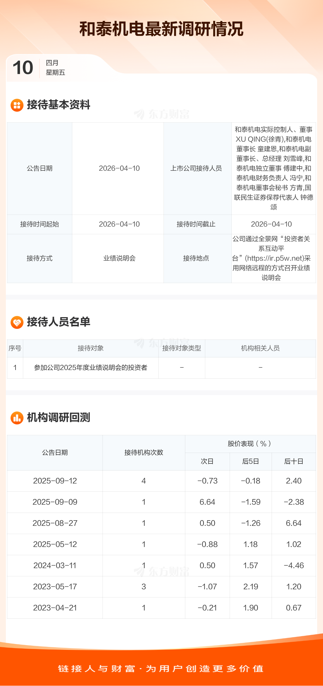 和泰机电4月10日公告称,4月10日接待参加公司2025年度业绩说明会的投资者等1家机构调研。接待人员包括和泰机电实际控制人、董事 XU QING(徐青),和泰机电董事长 童建恩,和泰机电副董事长、总经理 刘雪峰,和泰机电独立董事 傅建中,和泰机电财务负责人 冯宁,和泰机电董事会秘书 方青,国联民生证券保荐代表人 钟德颂。